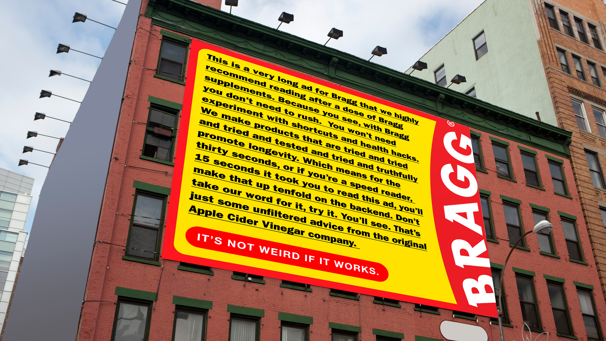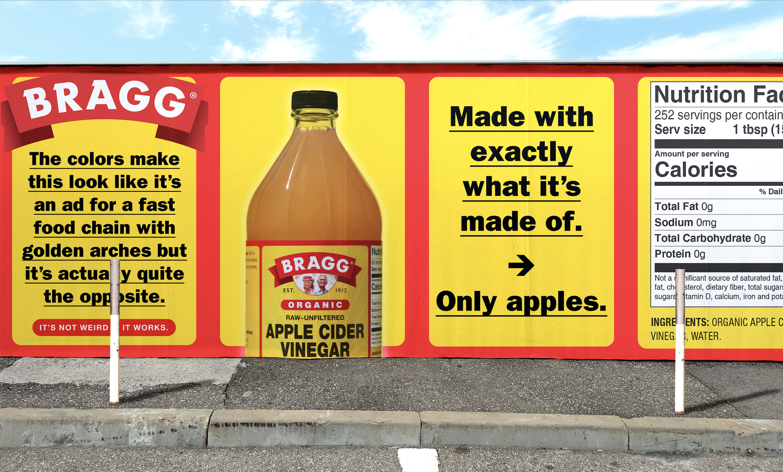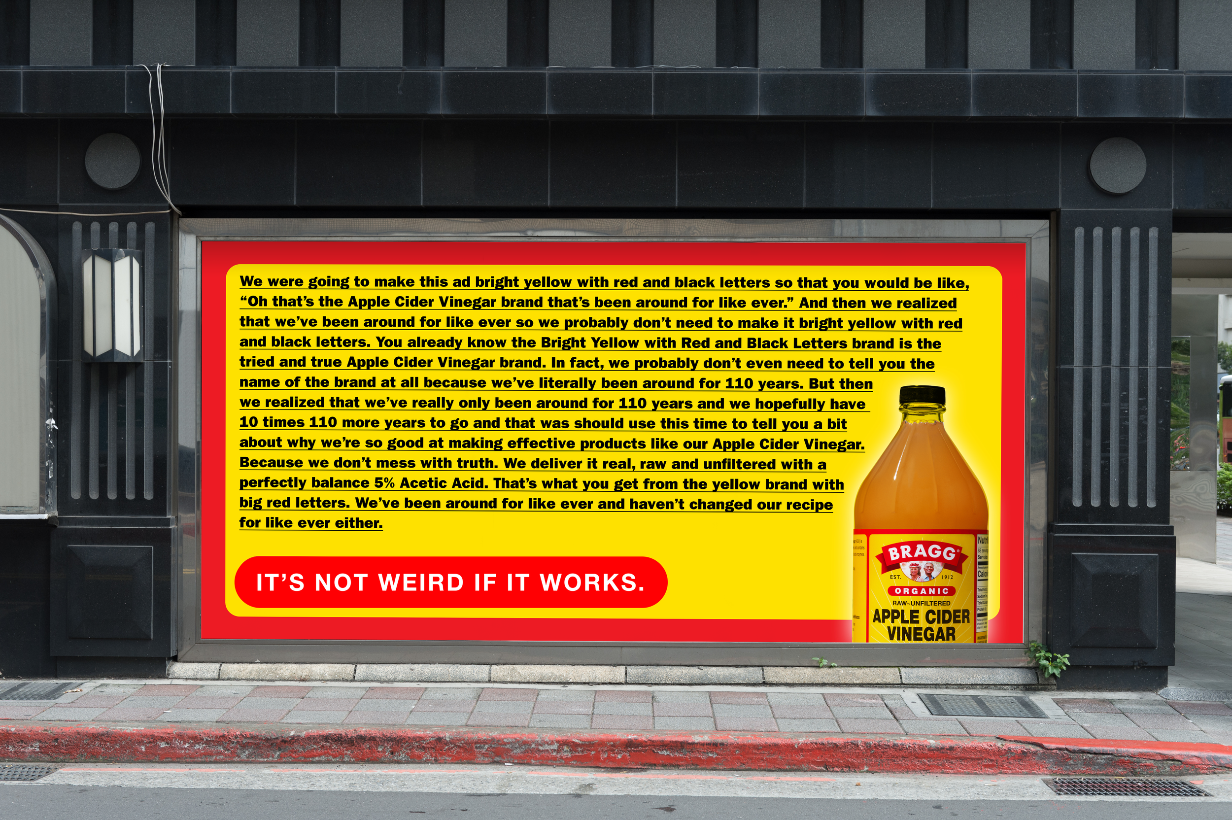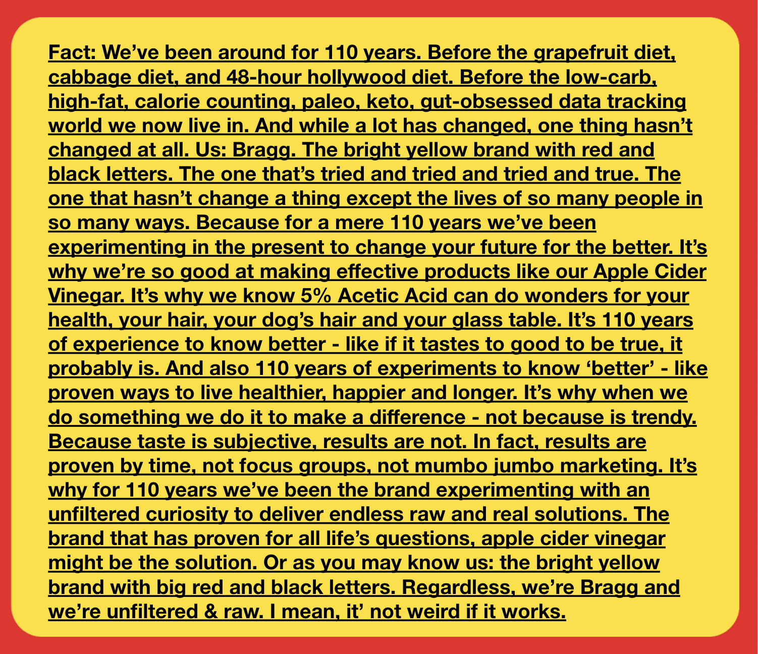It’s the big yellow label with a big red flag and black letters. It’s the brand you already have in your cabinet since you’ve had a cabinet. It’s the one you know you should us more of but you might not, or you might. It’s the one with all the writing on it. It’s the one that’s been around for 112 years and has never changed its recipe. Ever. It’s Bragg. A brand that’s unfiltered & raw and knows, it’s not weird if it works.